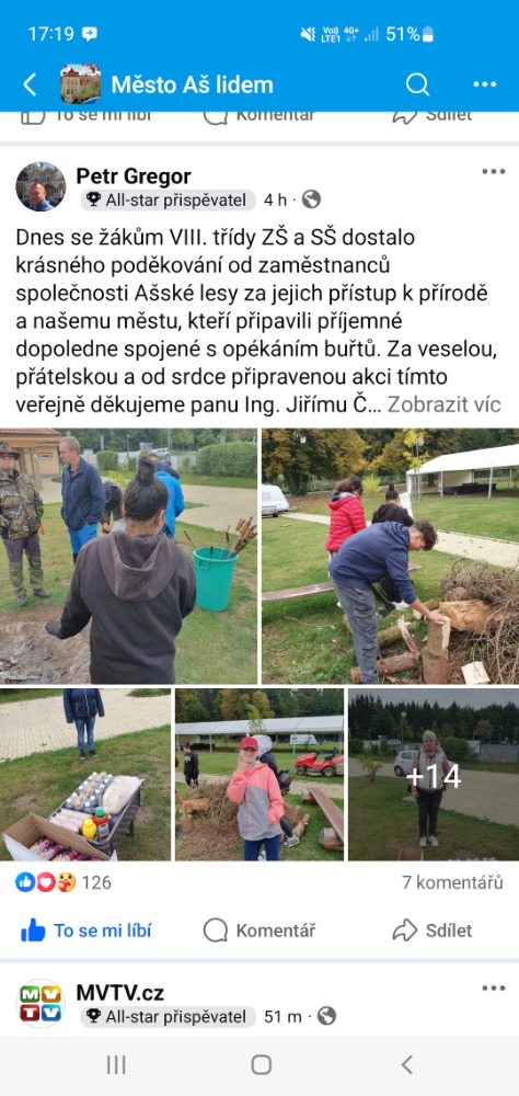 Ve středu 24.9.2025 se žákům VIII. třídy ZŠ a SŠ Aš dostalo krásného poděkování od zaměstnanců společnosti Ašské lesy za jejich přístup k přírodě a našemu městu, kteří připavili příjemné dopoledne spojené s opékáním buřtů. Za veselou, přátelskou a od srdce připravenou akci tímto veřejně děkujeme. Žákům tyto ohlasy veřejnosti zvyšují sebevědomí, občanskou gramotnost a pocit, že někam patří, mezi řádné občany našeho města. Třídní učitel Petr Gregor